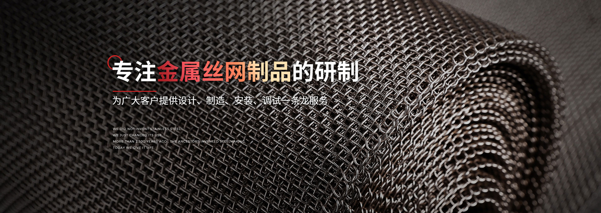 ABOUT US金属丝网是金属和丝网的合称,丝主要是指以金属、非金属为材质加工成的丝;网是以丝为原料,根据需求编织成不同形状、密度和规格的网。金属丝网以钢线、铜线制成,线条有粗细,网孔有大小规格,种类很多,习惯上称粗线大孔的为“网”,中线中孔的为纱,细线小孔的为布。表示规格时习惯上网孔在1/8”或1/8”以上的以网孔大小计算,在1/8”以下的以每英寸孔数计算,但也有说明线条直径和号数的。丝网是用作丝网印版支持体的